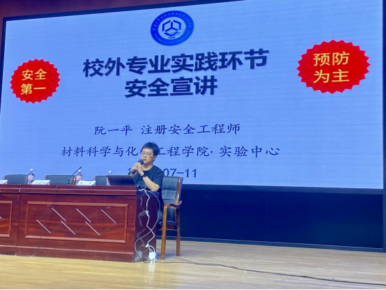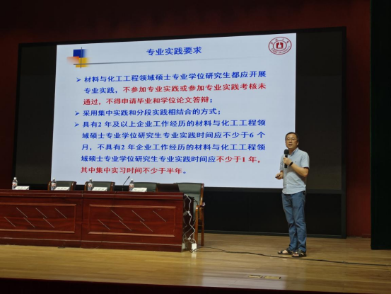 为进一步做好专业学位研究生专业实践工作,强化学生安全责任意识,7月11日下午,材化学院在忻元甫报告厅举办2024-2025学年专业学位研究生专业实践动员会暨安全教育大会。会议由学院学位点负责人王宗宝教授主持,中科院材料所研究生处处长陈益林、学院实验中心创安办主任阮一平、研究生专职辅导员姚禹阳出席会议,2023级全体专业学位研究生参加会议。