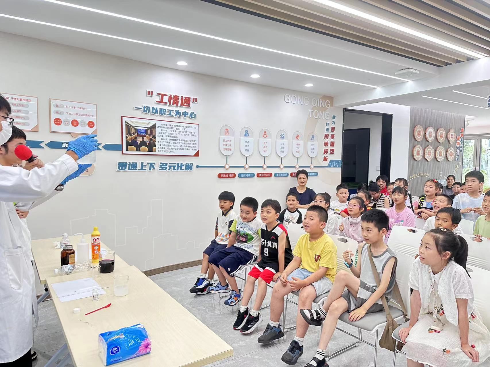 在“我是小小科学家”环节,实践团成员们现场指导小朋友们亲手参与实验操作,让他们在亲身体验中感受化学的奇妙之处。
