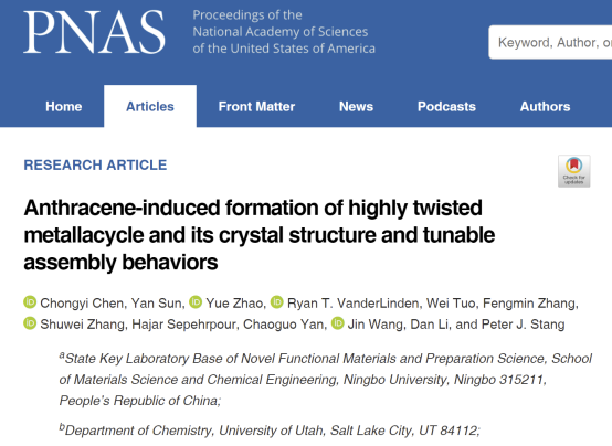 近日,PNAS在线发表了宁波大学材化学院陈重一副教授为第一作者,宁波大学为第一单位的题为“Anthracene-induced Formation of Highly Twisted Metallacycle and Its Crystal Structure and Tunable Assembly Behaviors”的研究论文。该论文的合作者为美国犹他大学的Peter Stang院士。