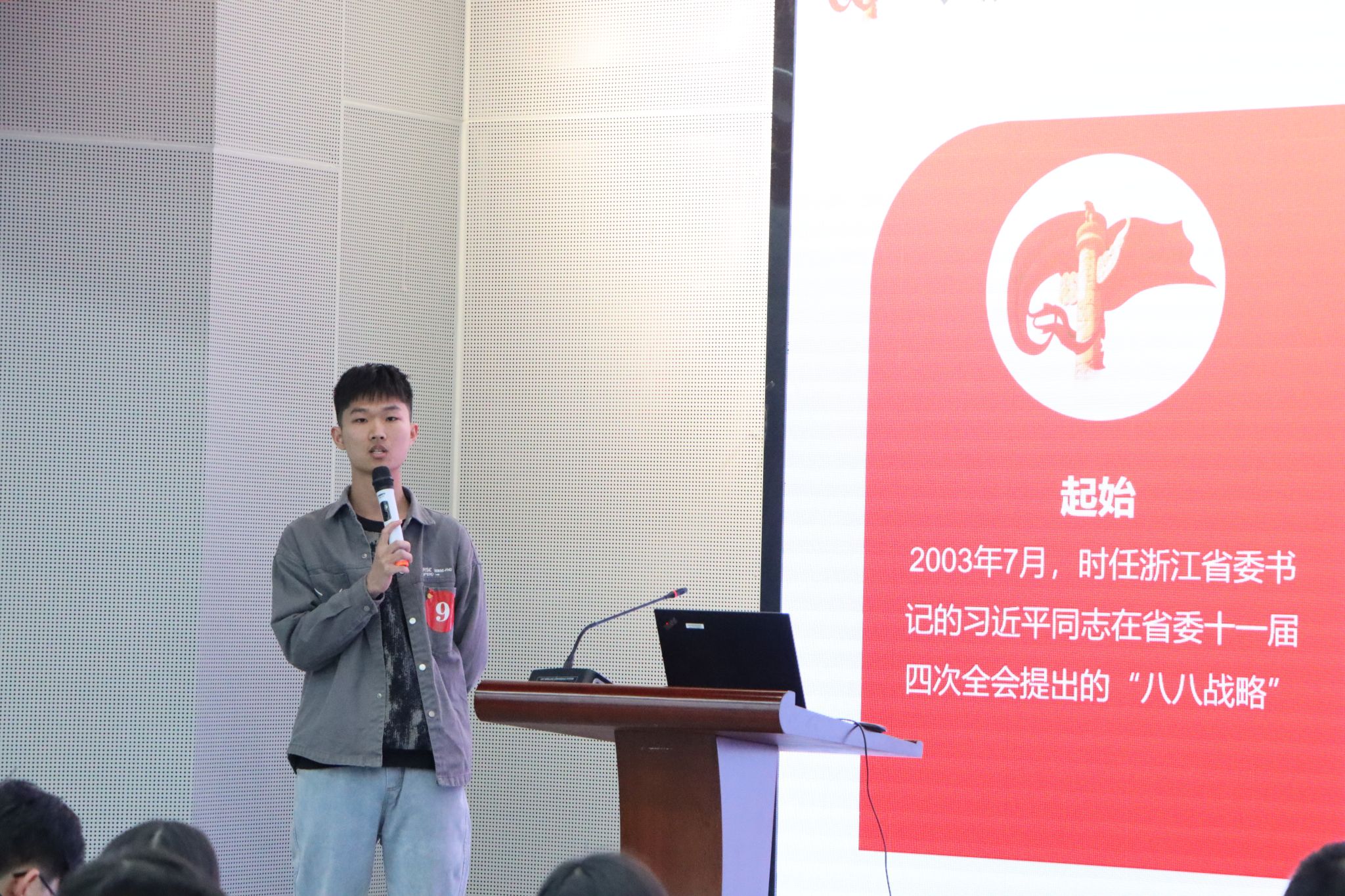 比赛现场,选手们紧扣时代主题,展现多元视角。或以党的百年奋斗历史和榜样人物事迹引发共鸣;或以科学的角度讲述数字化改革、八八战略的启发和思考;还有诸多同学从自身志愿服务、支教经历为视角,分享对新时代青年使命的感悟……选手们通过生动的案例、精彩的展现,将社会主义核心价值观融入微课,精彩而有感染力的演讲赢得现场阵阵掌声。