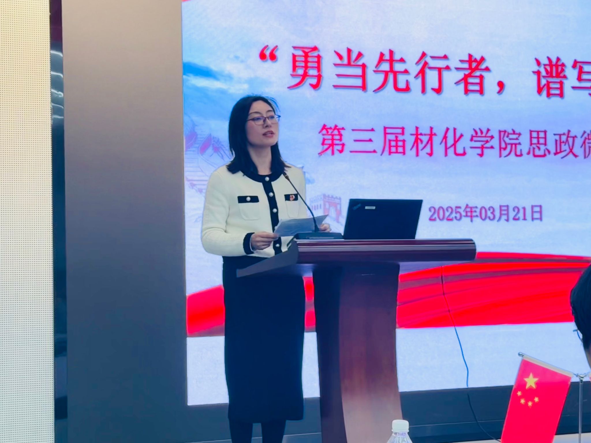 大赛伊始,尹慧进行动员讲话。她强调思政教育对青年成长的重要性,肯定了学院将思政教育与专业实践相结合的成果。并对参赛选手提出三点期待:一是以“真”动人,用真实故事传递信仰温度;二是以“新”致远,以青年视角诠释时代命题;三是以“融”聚力,在学科交叉中彰显思政厚度。鼓励同学们将个人理想融入国家发展,做心怀“国之大者”的材化人。