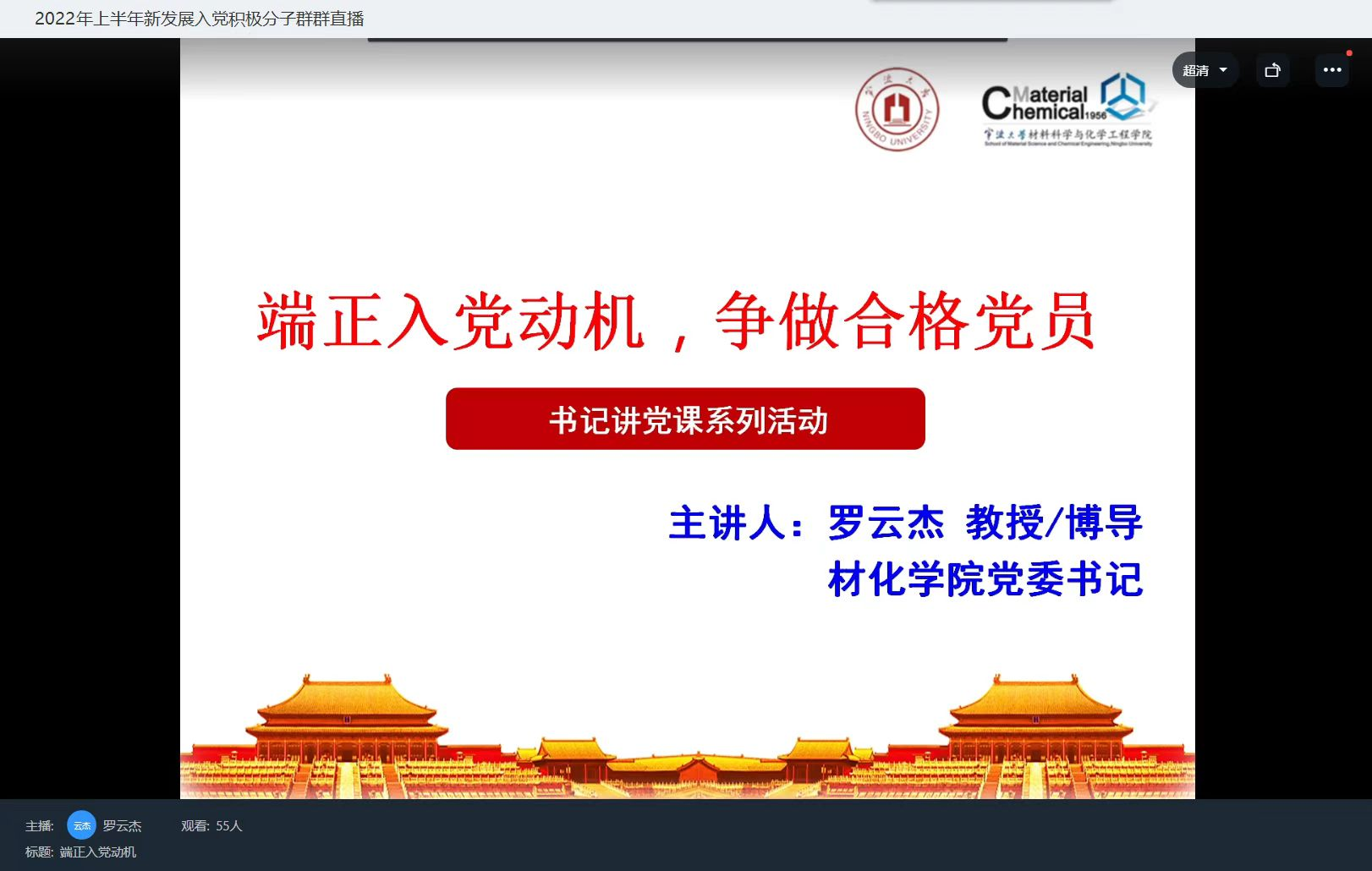 4月16日下午,宁波大学材料科学与化学工程学院分党校第二十三期培训班在钉钉课堂正式开课,宁波大学材料科学与化学工程学院党委书记、分党校校长罗云杰为新确立入党积极分子带来党课——《端正入党动机,争做合格党员》。