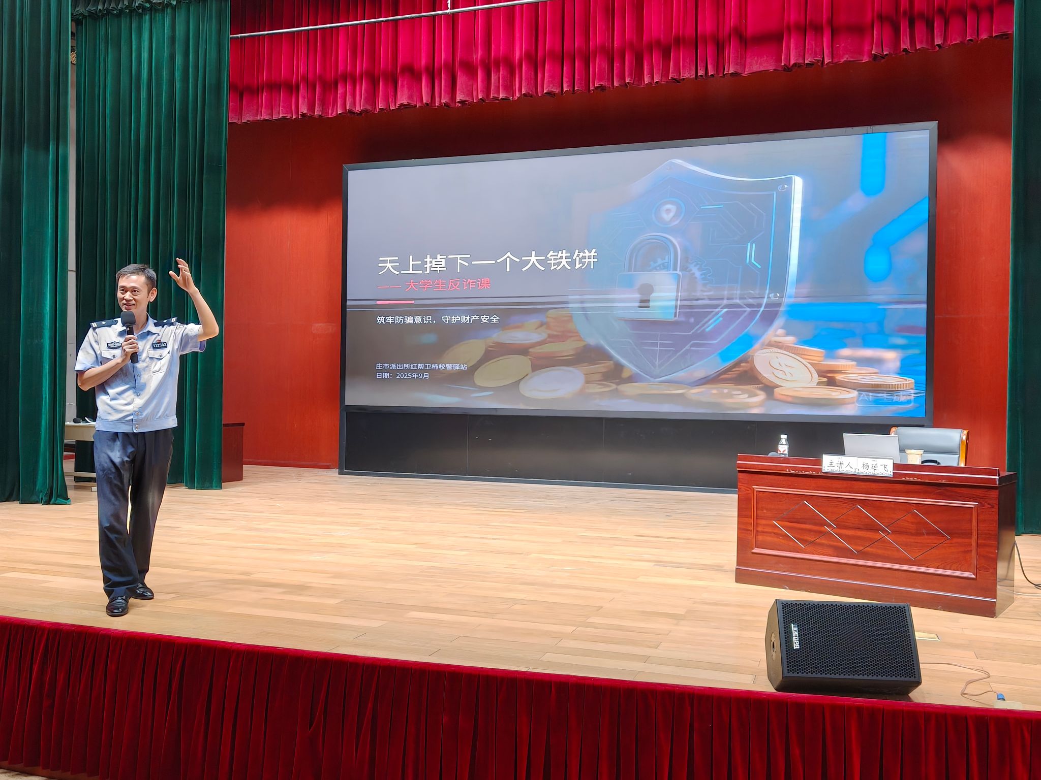 9月14日上午,材化学院在忻元甫报告厅举办2025级研究生新生反诈宣传教育专题讲座。本次活动特邀庄市派出所副所长杨延飞担任主讲嘉宾,学院2025级全体研究生新生积极参与。