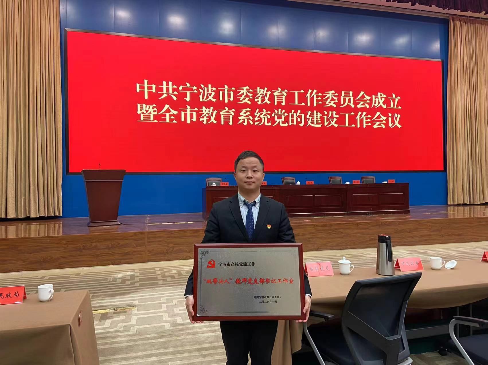 2024年1月25日,宁波市委教育工作委员会成立暨市教育系统党的建设工作会议在市行政会议中心召开。我院质谱院教师党支部作为宁波市首批“双带头人”教师党支部书记工作室培育创建单位,应邀参加了此次会议,并在现场授牌—宁波市高校党建“双带头人”教师党支部书记工作室,这也标志着该工作室正式通过创建验收。