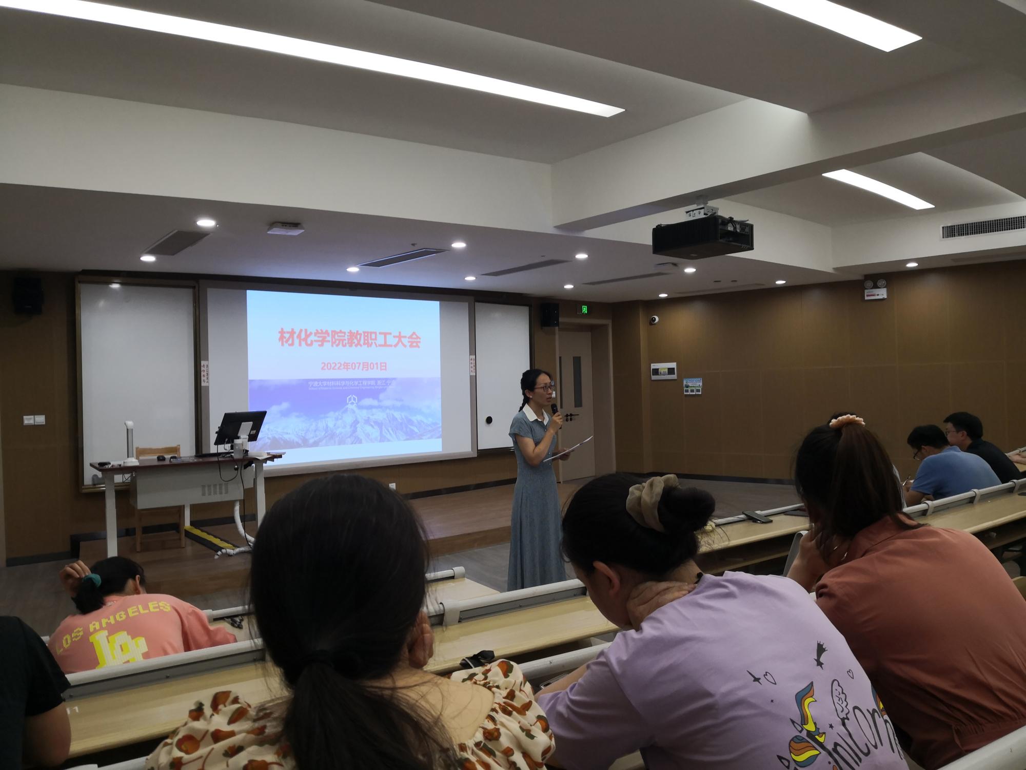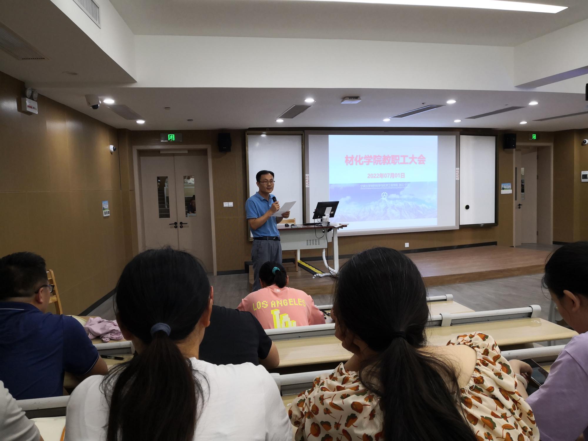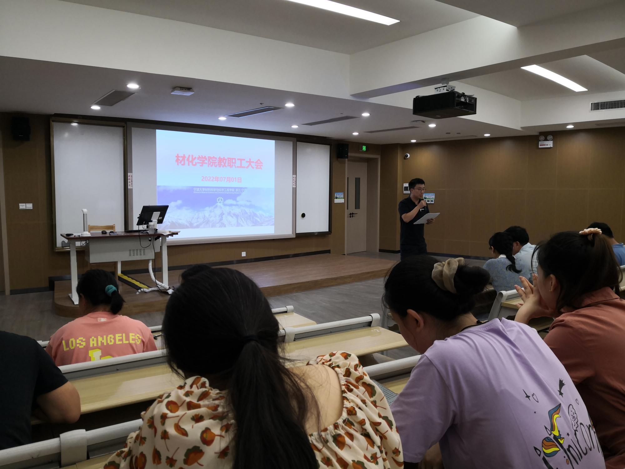 7月1日下午,材化学院召开全院教职工大会,学院党政班子全体成员及学院全体教职工参加了会议。