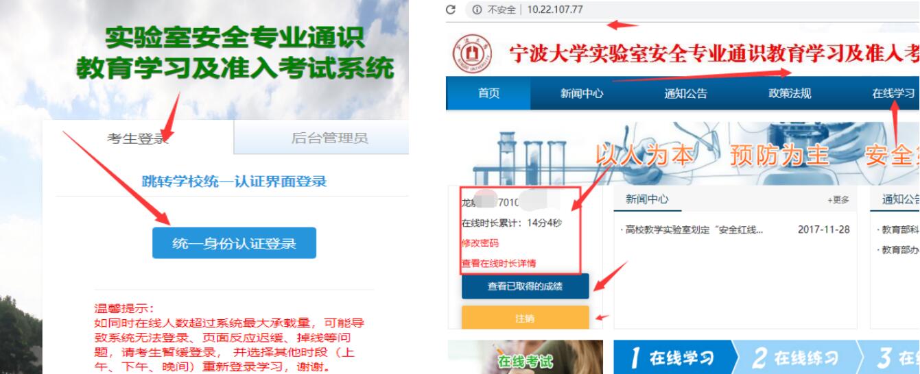 途径一:电脑端: 中 实验室安全教育 / 宁波大学实验室安全专业通识教育学习及准入考试 / 登录 / 统一身份认证登录”,输入学号、密码进入系统。