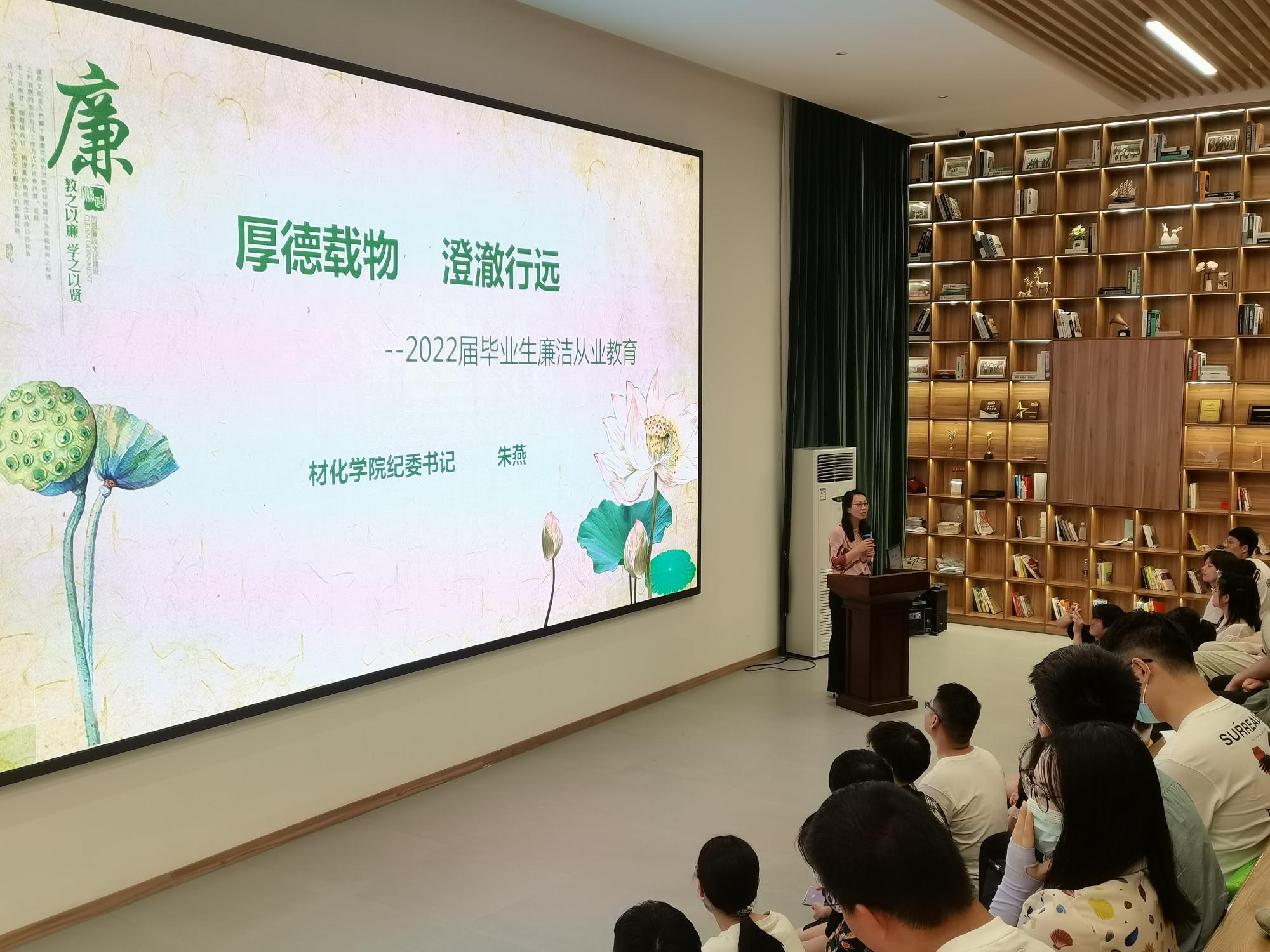 2022年6月16日,材化学院2022届毕业生党员廉洁从业主题教育系列活动在云创小镇路演中心顺利开展。此次活动由学院研究生联合党支部承办,学院纪委书记朱燕、辅导员、全体毕业生党员和研究生联合党支部全体党员参加了此次主题教育活动。