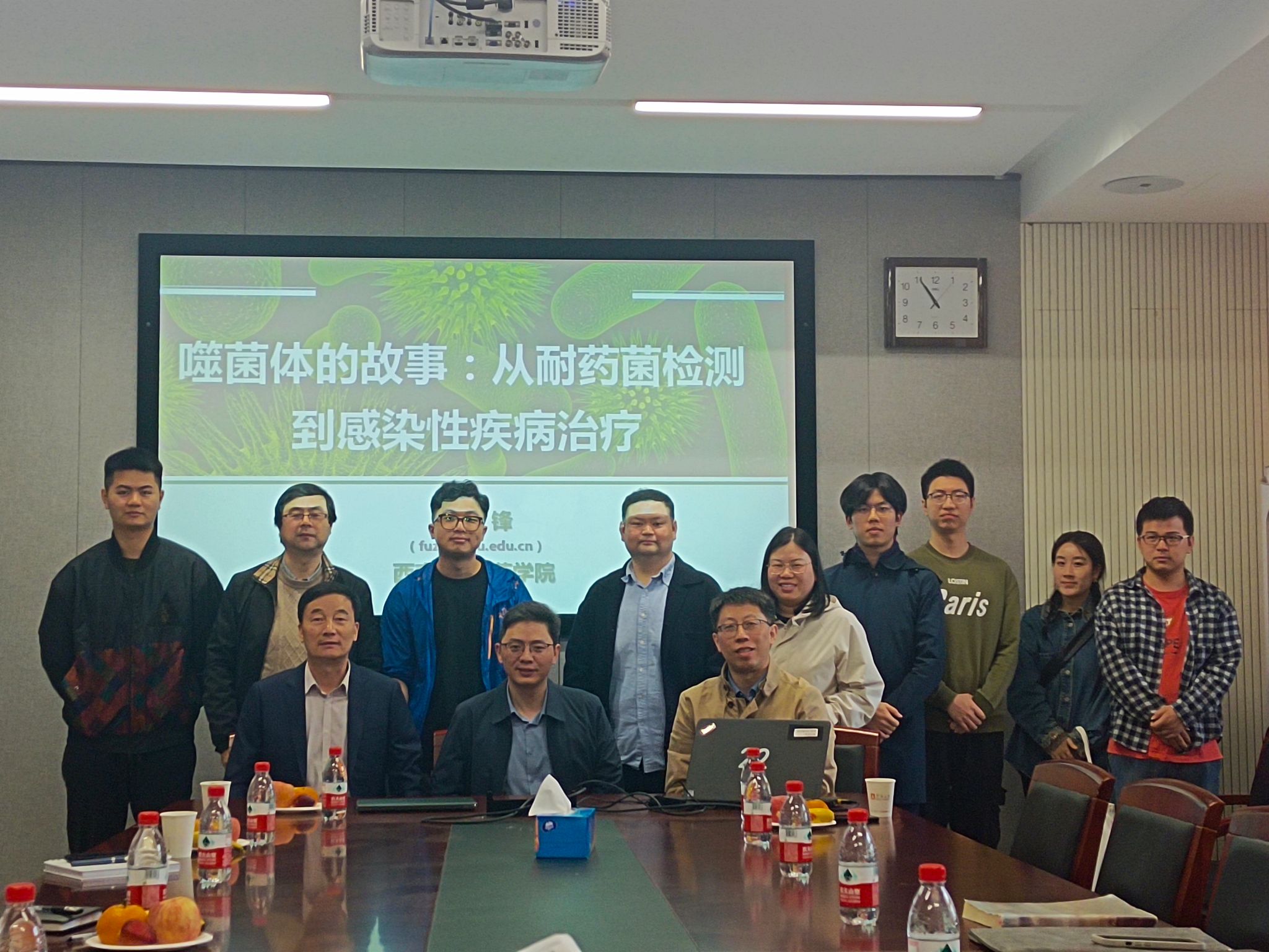 2024年4月23日上午,西南大学付志锋教授应邀到材料科学与化学工程学院作“噬菌体技术在细菌检测及耐药菌治疗中的应用”为主题的学术报告。报告在北区1号实验楼227会议室举行,由材化学院干宁教授主持,学院丁传凡院长,吴永祥老师,喻盛容老师以及材化学院相关专业的教师和学生到场参会。