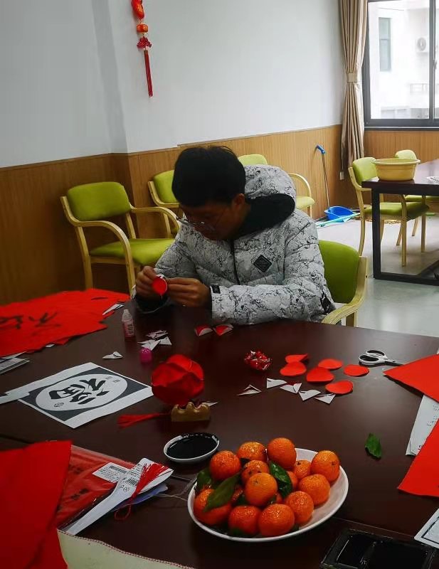 过年挂灯笼是中国的传统习俗,红色代表着喜庆,圆灯笼则寓意着美满团圆。团拜会上,师生一起动手制作手工灯笼。留学生“王子”写好“福”字后,就积极加入了制作灯笼的队伍。一开始他觉得很简单,没有向其他同学取经,结果制作的灯笼无法合拢。后来在老师的帮助下,他的红灯笼也顺利制作出来。“王子”很开心,举着自己的灯笼,用中文连连说:“漂亮!”女同学更热衷于手工制作,活动结束时,还纷纷留了红纸、丝线,准备回寝室继续制作红灯笼,要把寝室布置得红红火火,欢欢喜喜迎新年。