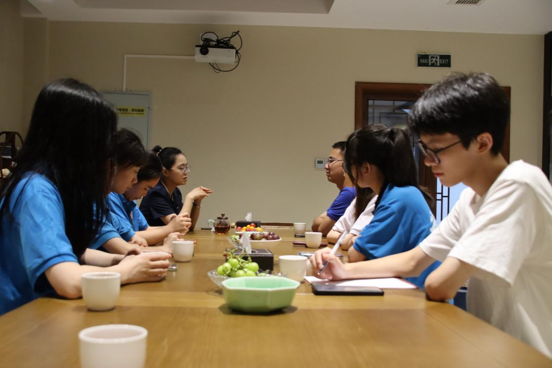 融媒体宣传推动旅游产业因时而新。在“问石”石雕艺术茶馆,新乡贤的茶馆主人,也是一名老党员,与蔚蓝青年们畅谈当下旅游发展的新业态和新布局。站在互联网发展的时代大背景下,要敢于突破先前“酒香不怕巷子深”的理念,善用宣传、智用宣传。茶馆主人向同学们介绍了制作短视频、公众号的相关经验和技术,结合摄影、视频剪辑、灯光布置等科技手段推动路下徐村的宣传。同时作为舟山公益美术协会的理事,茶馆主人向同学们展示了精美的石雕艺术,并热情澎湃地介绍发展愿景。他希望通过艺术研学的方式制作、推广带有路下徐村特色的旅游文创产品,带动旅游产业附加值进一步提升,为老龄化乡村提供新鲜血液,带动本土经济发展,打造具有当地特色的旅游体验。