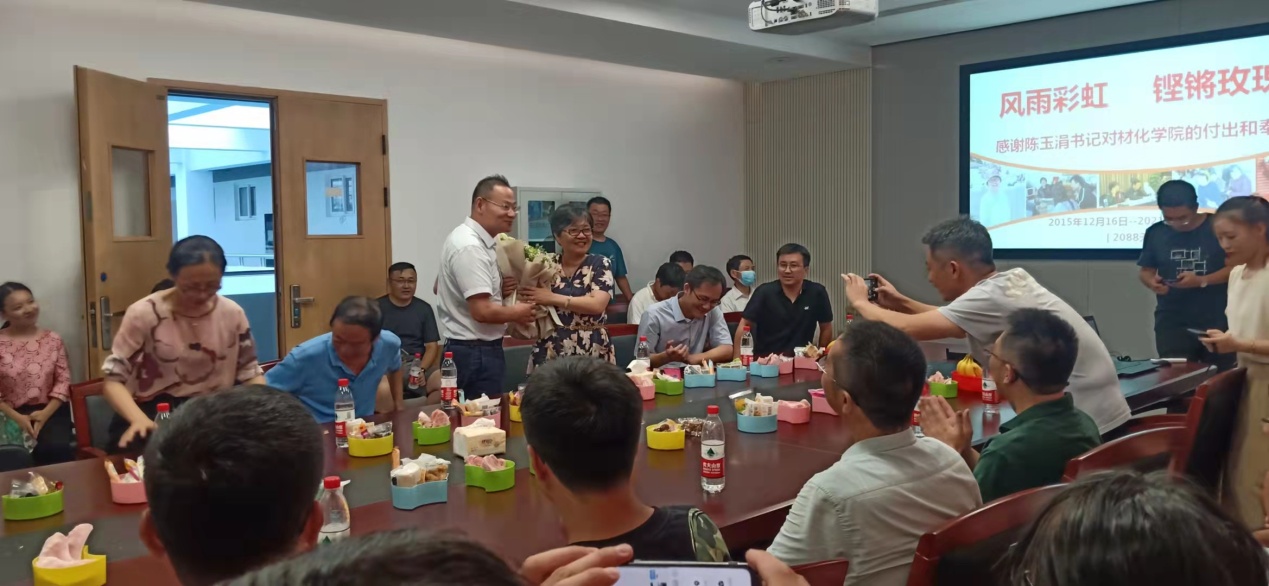 下午三点不到,学院227会议室来了很多人。当陈玉涓出现在会议室门口时,大家与她亲切相拥合影。工会副主席毕文超主持了欢送仪式。首先是播放主题为“风雨彩虹、铿锵玫瑰”的VCR回顾陈书记在材化学院的2088天。