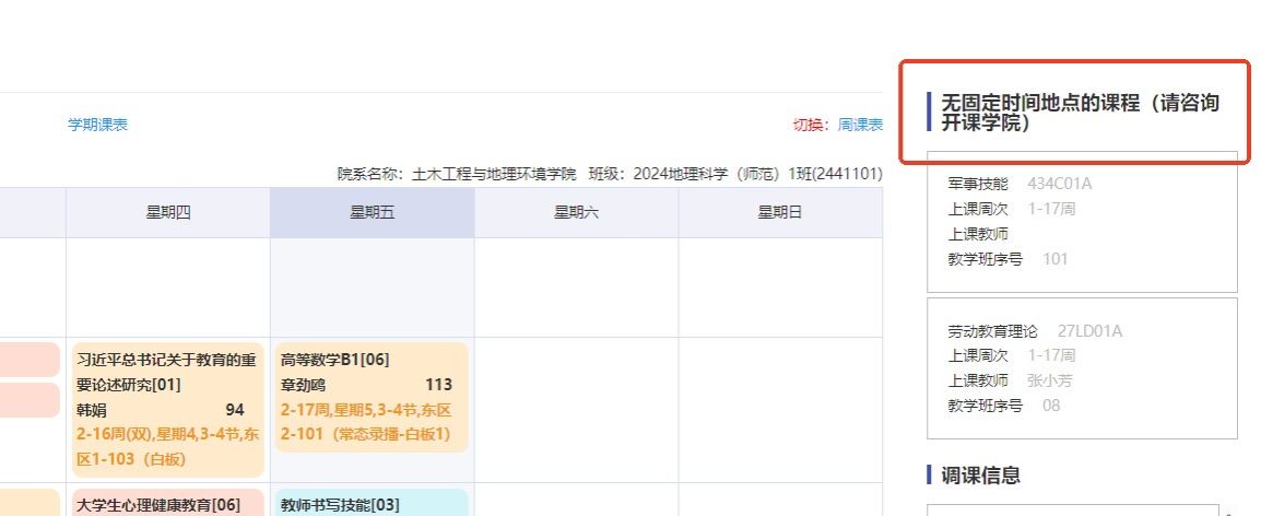 7.同学进入“我的课表”app查询课表的时候看到右上角有“无固定时间地点的课程(请咨询开课学院)”(如下图所示),此类课程具体上课时间、地点不在系统中体现,请选了此类课程的同学务必要联系该课程所在学院的任课老师,明确具体的时间和地点。