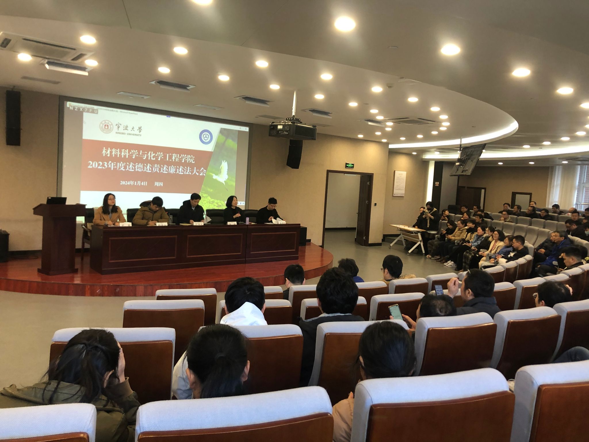 在北区杨咏曼楼二楼会议室召开述德述责述廉述法报告会暨全体教职工大会。会议由院党委书记陶娟主持,学院党政班子、全体教职工参加会议。