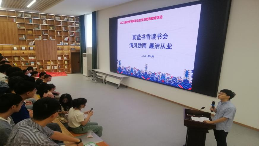 6月22日上午9:00,材化学院在云创小镇路演大厅举办了毕业生党员思政教育活动暨蔚蓝书香读书会——清风劲雨,廉洁从业。本次活动由研究生无机材料党支部承办,旨在进一步加强毕业生党员的党史党纪党规、法纪法规教育,牢筑廉洁从业思想道德防线,深化“不忘初心、牢记使命”主题教育成果。