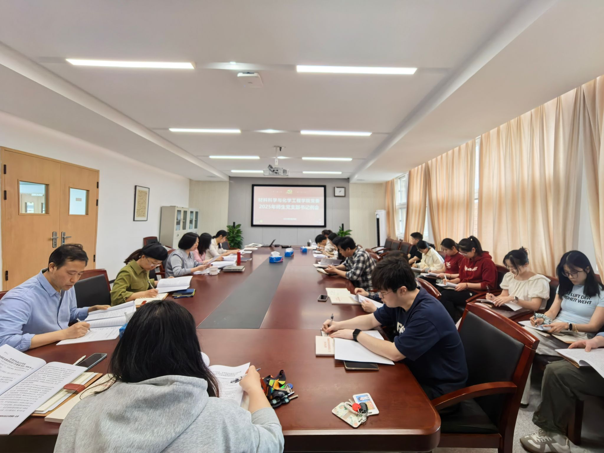 会议伊始,陶娟书记带领全体参会人员深入学习了全省党的建设会议精神以及全省高校党的建设工作会议精神。通过学习,大家对党建工作的重要性和紧迫性有了更深刻的认识,为后续工作的开展奠定了坚实的思想基础。随后,会议进入布置本学期党建工作的环节。一是部署启动中央八项规定精神学习教育,引导全体党员进一步强化纪律意识和规矩意识;二是组织学习《全国党员教育培训工作规划(2024—2028 年)》,提升党员教育培训工作的科学性和系统性;三是解读《材化学院师德教育实施方案》,并布置师德教育相关工作,强调师德师风建设对于学院发展的重要性;四是通报年度工作任务清单,副书记尹慧对《材化学院 2025 年“崇廉尚洁树新风 奋楫扬帆启新程”清廉材化党风廉政建设宣传教育活动方案》进行详细解读,为清廉材化建设指明方向;五是布置党委2025年工作要点,推动各党支部工作有序开展。