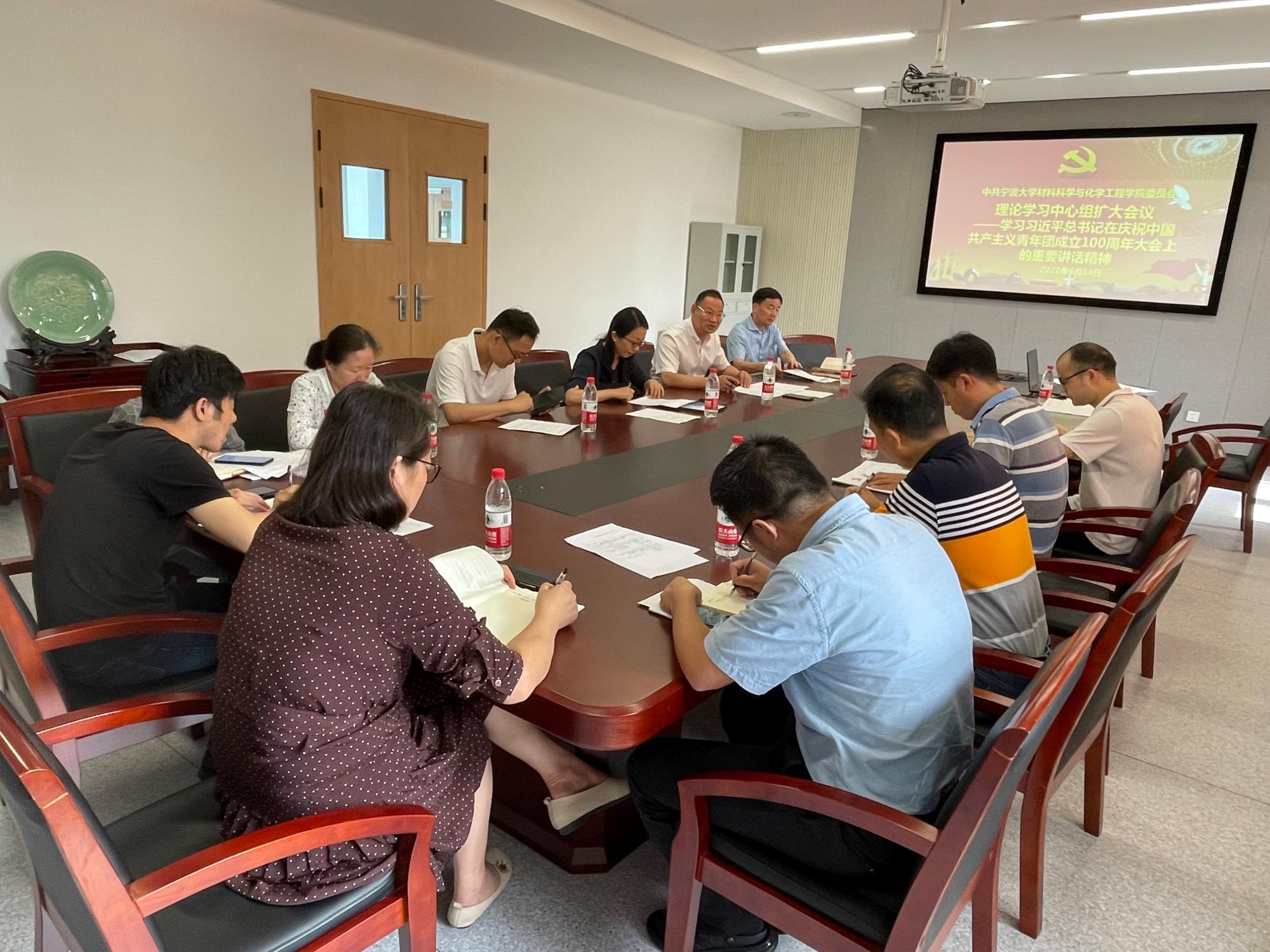 6月14日上午,材化学院党委在北区慎思楼1227会议室召开理论学习中心组扩大会议,专题学习习近平总书记在中国人民大学考察时重要讲话精神及习近平总书记在庆祝中国共产主义青年团成立100周年大会上的重要讲话精神。院党委书记罗云杰主持会议并讲话。