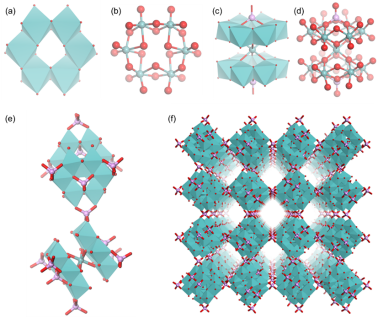 图1 PM的结构模型:[Mo6O24]单元的(a)簇状模型,(b)球棍模型,[P2Mo13O50]单元的(c)簇状模型,(d)球棍模型,PO4连接体连接的[P2Mo13O50]单元的(e)簇状模型,(f)PM的框架结构,Mo:蓝色P:紫色,O:红色