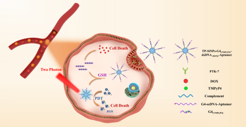 本研究构建了一种TP-SiNPs-G4(TMPyP4)-dsDNA(DOX)-Aptamer(TGTDDA)“智能生物导弹”,旨在实现双光子荧光成像引导下的肿瘤联合靶向治疗。结合核酸适配体,“智能生物导弹”可以对肿瘤进行精准的靶向识别。本研究构建“智能生物导弹”TGTDDA能够对肿瘤细胞进行双光子荧光成像,以及对肿瘤组织实现深层的双光子荧光成像。利用该体系对组织进行单光子荧光成像与双光子荧光成像,后者可获得约230 μm的更深组织穿透能力和更高的时空分辨率。肿瘤细胞内谷胱甘肽表达水平的升高,触发了该体系中化疗药物阿霉素的释放。而双光子荧光可有效激活该体系中的光敏剂TMPyP4,从而启动光动力学疗法。在该研究中,光动力学疗法与化疗的联合作用显著提升了肿瘤的治疗效果。因此,本研究开发的“智能生物导弹”能够为肿瘤的早期诊断和治疗提供新的有效手段,在肿瘤的实时高灵敏诊疗领域中具有良好的应用前景。