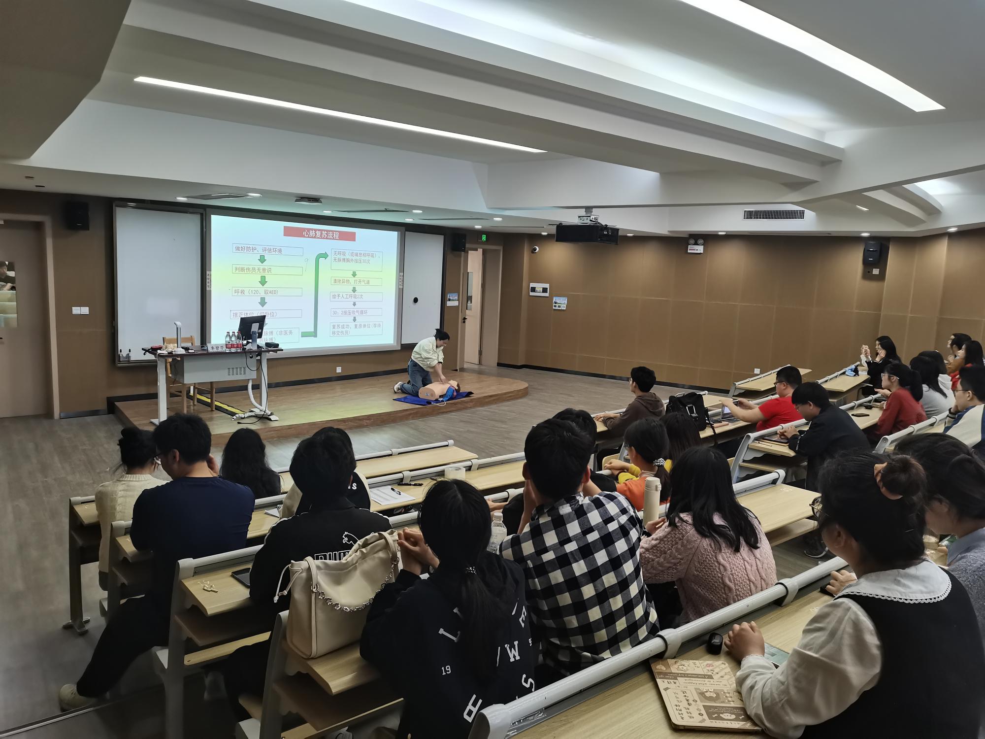 季碧芳从应急救护的目的入手,结合生动有趣的语言,真实的案例,详细讲解了止血包扎、异物梗阻、心肺复苏及烧烫伤等意外伤害应急救护的专业知识,并且对相关救护操作要领进行了现场示范。讲座过程中,季碧芳与学生频繁互动,用手把手的方式让学生基本掌握了胸外按压、人工呼吸等日常救护方法,尤其重点强调了在实际生活中,应抓住最有效的“黄金四分钟”时间,去挽救自身及他人生命。一个个典型的实例,一组组惊心的数据,让学生明白了生命的珍贵。活动现场互动体验趣味十足,大家学习兴趣高涨。