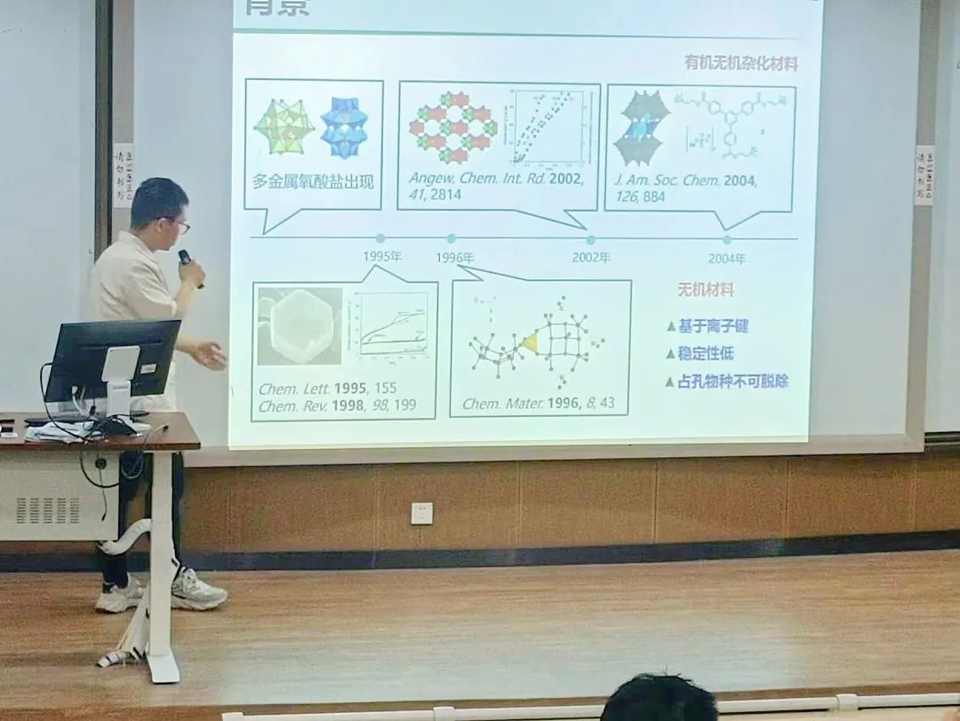 讲座伊始,张祯歆先以自身不断进取的励志求学经历及工作经历为引子,激励同学们要把努力奋斗作为途径,勇于尝试是打开未来大门的钥匙。接着,他又点出“科创的主题应该是为需求而开拓,以痛点为创新”,并以当前工厂对于合成与分离技术有更严格的需求出发,为同学们详细介绍了过渡金属氧化物分子筛,以MoVO、基于Cubane的ZOMO和基于ε-Keggin的ZOMO为例,为同学们讲述了ZOMO具有有序微孔性和氧化还原性等优良属性,以及ZOMO在吸附分离和催化领域的应用。