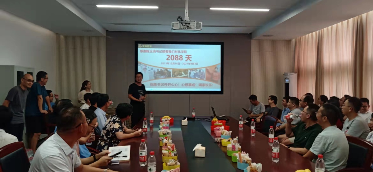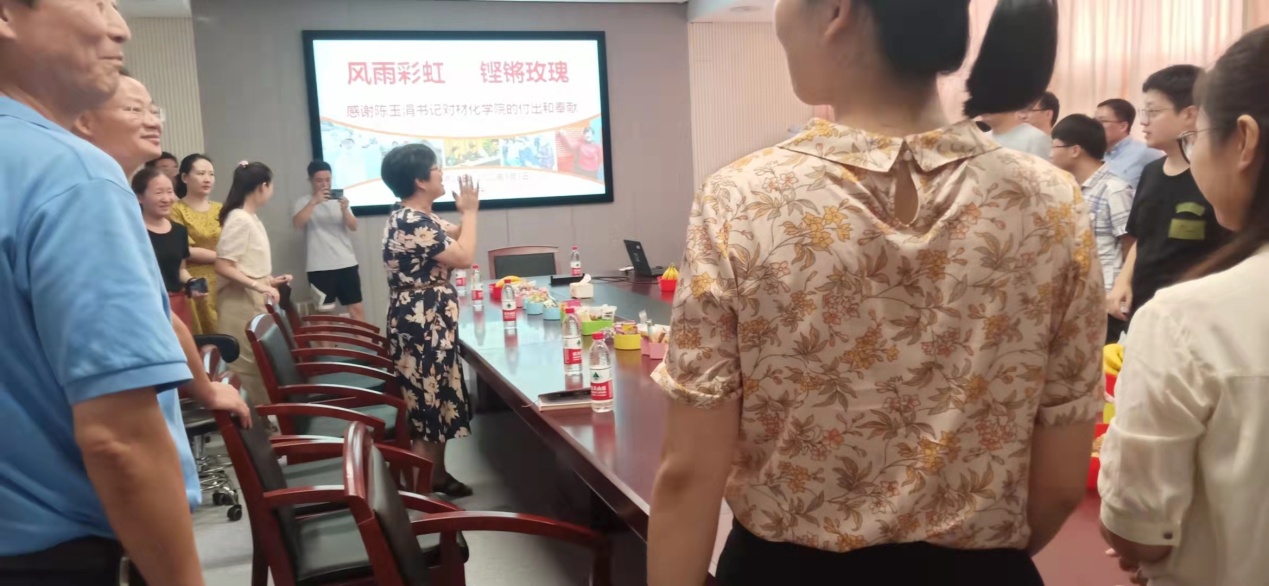 下午三点不到,学院227会议室来了很多人。当陈玉涓出现在会议室门口时,大家与她亲切相拥合影。工会副主席毕文超主持了欢送仪式。首先是播放主题为“风雨彩虹、铿锵玫瑰”的VCR回顾陈书记在材化学院的2088天。